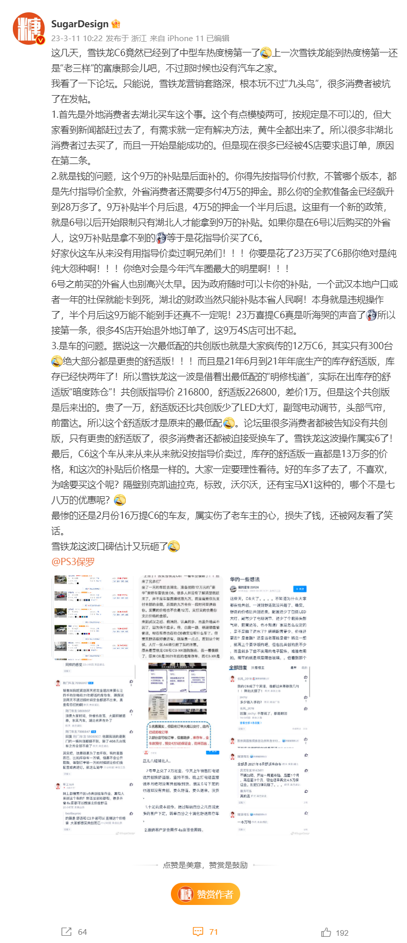 目前,上文这些雪铁龙C6车主的补贴款还没有到账,车主们也在集体讨要说法。