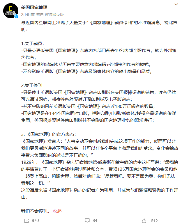 最后,对于此次裁员和部分发行渠道的取消,美国《国家地理》官方发言人表示: