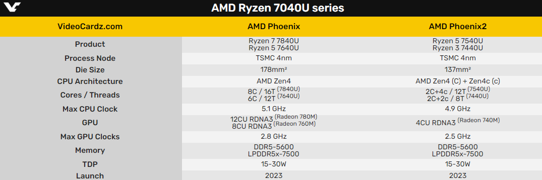 根据AMD官方公布的规格参数,同样是锐龙7000U系列处理器,但所用芯片却不一样:8核心的锐龙7 7840U、6核心的锐龙5 7640U代号Phoenix1,面积178平方毫米,6核心的锐龙5 7540U、4核心的锐龙3 7440U代号代号Phoenix2,只有137平方毫米,缩小了足足23%。