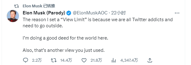 马斯克在推文的最后还调侃:“你又用了一次浏览次数“。根据目前最新的政策,推特的普通用户每天只能浏览1000条推文。