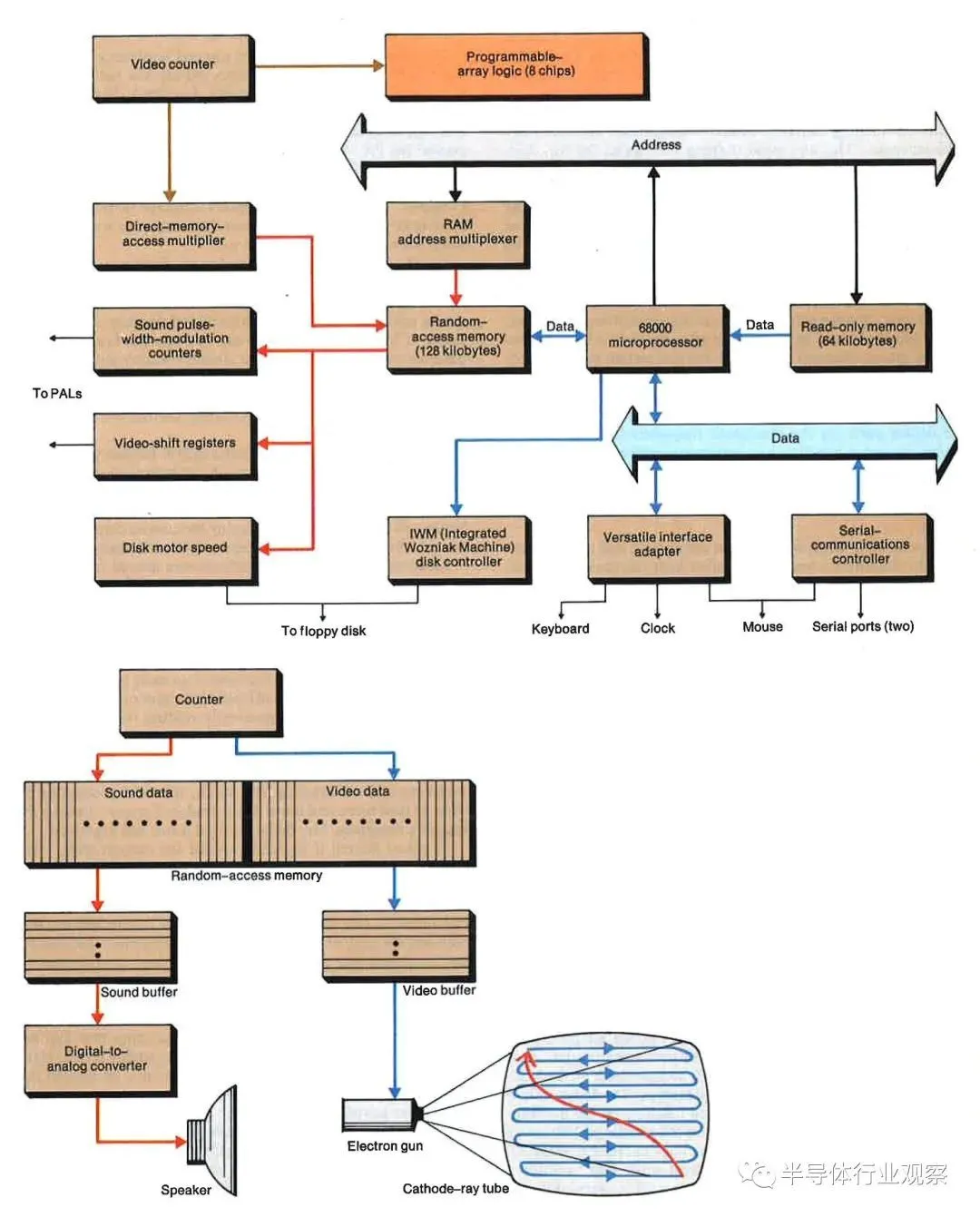 68000 微处理器可以独占访问 Macintosh 的只读存储器,以全速(0.83 兆赫)从 ROM 获取命令。68000 与视频和声音电路共享随机存取存储器,只能在部分时间访问 RAM [A];它以大约 6 兆赫兹的平均速度从 RAM 中获取指令。视频和声音指令分别直接加载到视频移位寄存器或声音计数器中。Macintosh 的大部分“粘合”电路都包含在八个可编程阵列逻辑芯片中。Macintosh 播放四种独立声音的功能是在设计的较晚阶段才添加的,当时人们意识到视频电路中已经存在了所需的大部分电路 [B]。这四种声音被添加到软件中,并且数字样本存储在存储器中。