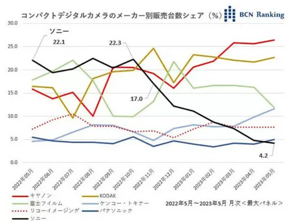 但是在随后的几个月里,索尼的份额一路下跌。在2022年11月,索尼紧凑型相机市场份额便跌至了17%,在最新的2023年5月里,索尼的份额仅剩4.2%,位列市场第七。