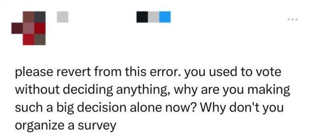 有网友呼吁,“请改正这个错误。你以前在投票时都不做出任何决定,为什么现在要独自做出这么大的决定?你为什么不组织一次调查。”
