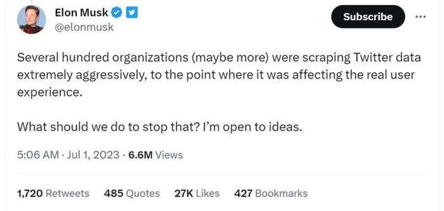 此前,马斯克曾对人工智能公司抓取推特数据,并将推文用于研究或训练人工智能程序表示不满。