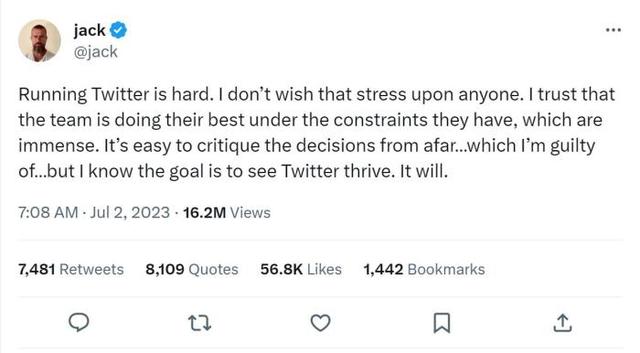 推特联合创始人、前首席执行官杰克·多尔西随后发表了对此事的看法,他表示,“运营推特是很困难的。我不希望任何人受到这种压力。我相信这个团队在巨大的限制条件下,正在尽最大努力。从远处批评这些决定是很容易的……我也对此感到歉疚……但我知道他们的目标是要看到推特的繁荣。它会的。”