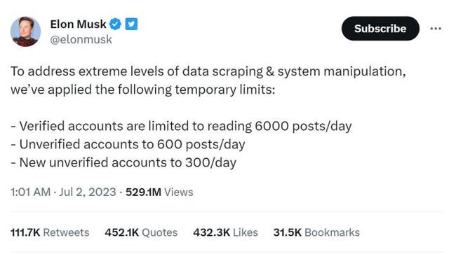 收购近一年,马斯克对于推特的改革仍在进行中。他最新宣布要限制用户每日的推文浏览量,以避免使用人工智能模型的公司对推特进行“数据抓取和系统操纵”。