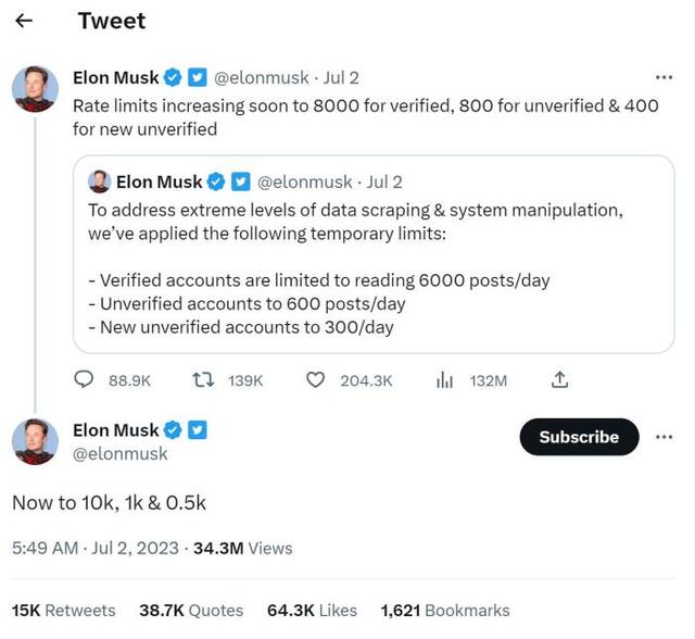 对此,马斯克很快做出了反应。在宣布最初限制后仅几小时,他又发文称,将限制提高到了已验证账户8000条、未验证账户800条、新的未验证账户400条,并在当天再次将限制浏览量分别提高到了10000条、1000条和500条。