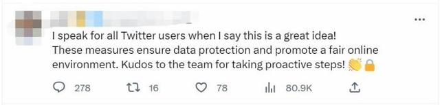 但也有网友对此表示欢迎,表示“我代表所有的推特用户声明,这是一个好主意!这些措施能确保数据得到保护,同时促进公平的网络环境。感谢团队采取积极措施。”