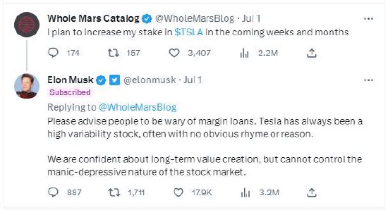 特斯拉CEO埃隆·马斯克周六警告投资者,要对保证金贷款保持警惕,因为特斯拉是一只高度波动的股票。这一警告正值特斯拉公布第二季度交付数据前夕,在网友当中引发了强烈反响和猜测。马斯克是在回应特斯拉网红博主Whole Mars Catalog的一条推文,后者表示有意在未来几周和几个月内增持特斯拉股票。