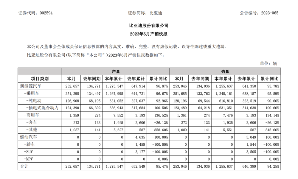 7月2日,比亚迪公布了6月销量成绩:新能源汽车销量253,046辆,同比增长88.79%;1-6月,新能源汽车累计销量1,255,637辆,同比增长95.78%。