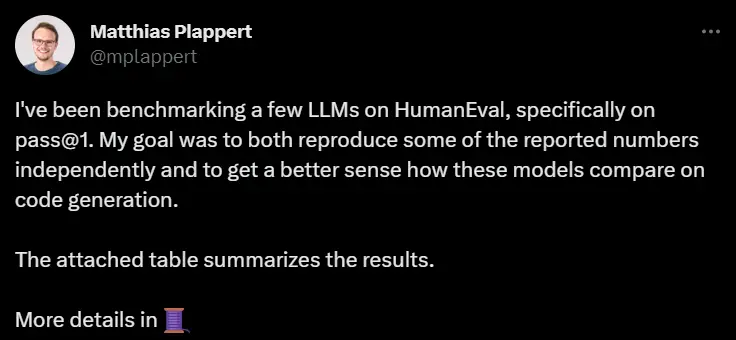 Plappert是一位知名的计算机科学家,他在HumanEval上发布了自己对AI圈主流的LLM进行的基准测试结果。