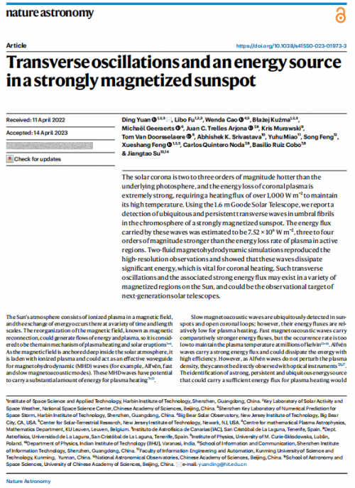 5月25日,该成果以“Transverse Oscillations and Energy Source in a Strongly Magnetized Sunspot”《强磁化太阳黑子中的横模振荡与能量源》为题发表在《自然·天文学》上,哈工大(深圳)副教授袁丁为第一兼通讯作者,硕士研究生付立博为第二作者,教授冯学尚和博士后Blazej Kuzma为合作作者。记者了解到,这项研究集合了欧洲、美国等多国科学家、科研机构的共同努力。哈工大(深圳)空间科学与应用技术研究院冯学尚教授与袁丁副教授作为课题发起者,承担了“总设计师”的工作,助人类理解太阳再上台阶。