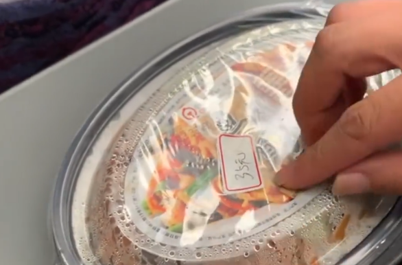 视频显示,该网友购买的“鱼香肉丝”盒饭包装外层手写标签为35元,也是他实际购买价格。