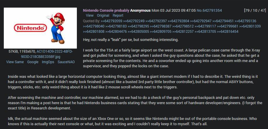 一位匿名用户7月3日在4chan论坛上发布了一个帖子,他表示自己在美国西海岸一个相当大的机场为运输安全管理局工作。有一次,爆料者和主管对一个巨大的安全箱进行私人检查时,他发现箱子内装是一台类似巨大网络调制解调器的奇怪机器,并且同时它也拥有一个控制器,看上去还没有完全完成,拥有正常控制器的ABXY按键、扳机键、摇杆等,最奇怪的是控制器的扳机键旁边有两个类似鼠标滚轮的部件。