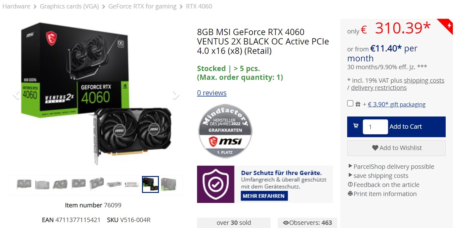 尤其是在欧洲,零售商们很快就开启了降价模式,比如德国大型电子零售商MindFactory,将首发价329欧元的微星RTX 4060万图师OC,降到了310欧元。