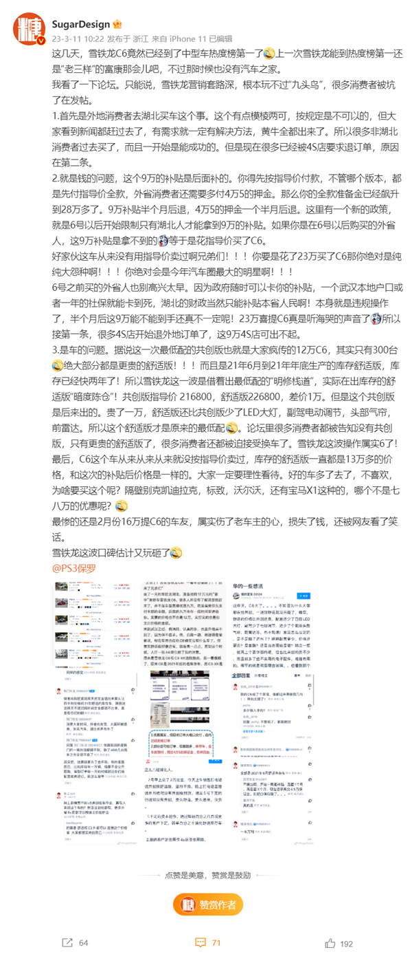 需要注意的是,当时雪铁龙C6的优惠模式是先全款购买,之后再发放补贴,结果最近就出了问题——补贴没到位。