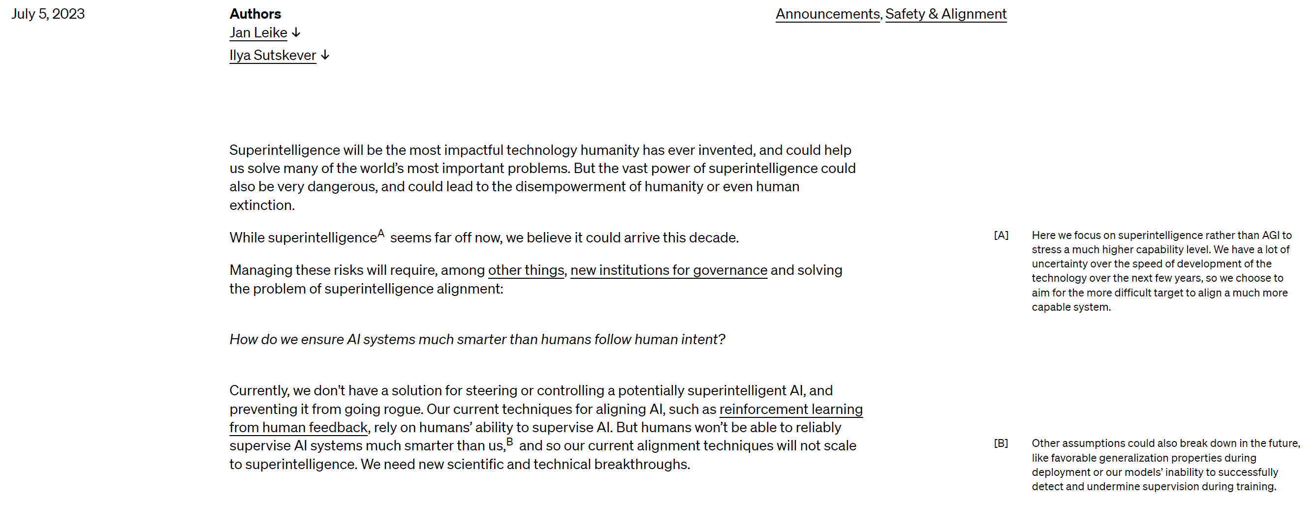 OpenAI联合创始人Ilya Sutskever和负责提高系统安全性的AI一致性团队负责人Jan Leike在一篇博客文章中写道:“超级智能的巨大力量可能……导致人类被剥夺权力,甚至人类灭绝。”