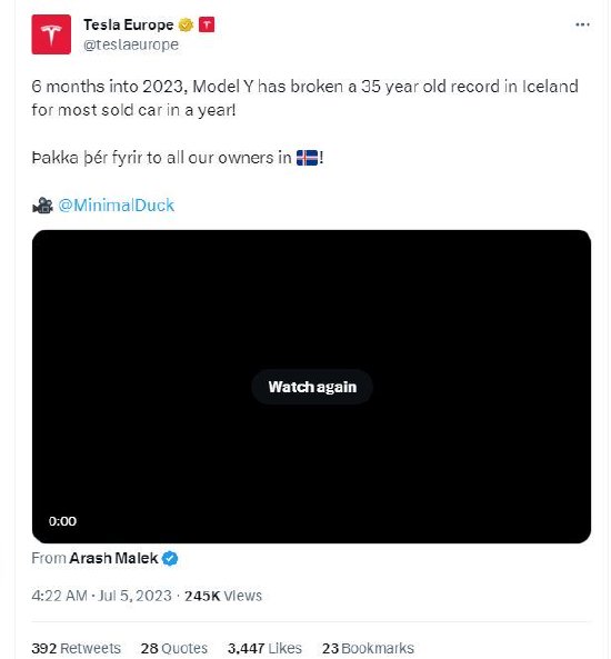 2023年刚过去一半,特斯拉Model Y在冰岛打破了丰田卡罗拉35年前创下的年度销量纪录。特斯拉欧洲公司周三发推称:“2023年刚刚过去6个月,Model Y就在冰岛打破了一项35年之久的年度销量纪录!”