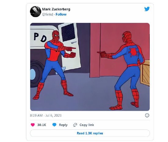 在Meta推出类似推特的社交应用Threads之际,该公司创始人马克·扎克伯格布了他十多年来的第一条推文,用一个蜘蛛侠的表情包来纪念Instagram推出的推特竞品Threads。