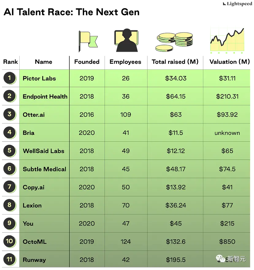 除了八家领头公司外,文章还统计出11家非常有潜力的,将模型应用于实际场景、直接对接用户的公司,也许就是下一次AI技术革新的领头羊。