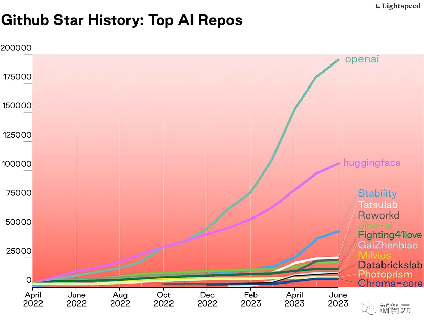 出于这个原因,Github上相关的人工智能项目stars数量也能展现出一定的技术趋势,任何人都可以做出贡献并学习如何开发人工智能应用程序,最近已经开始呈爆炸性增长,特别是OpenAI在2022年11月30日向公众发布ChatGPT后。