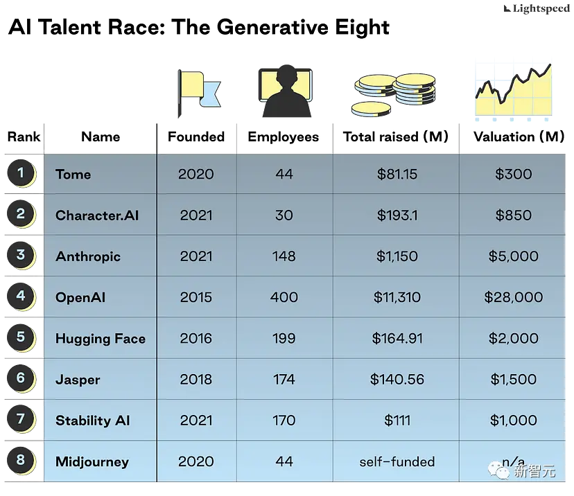 根据公开的员工信息,如学校教育、高级学位、曾就职公司、工作年限、专利、出版物等进行排名,从3500多家从事生成式人工智能业务的公司角逐出八家以AI研发为核心的公司。