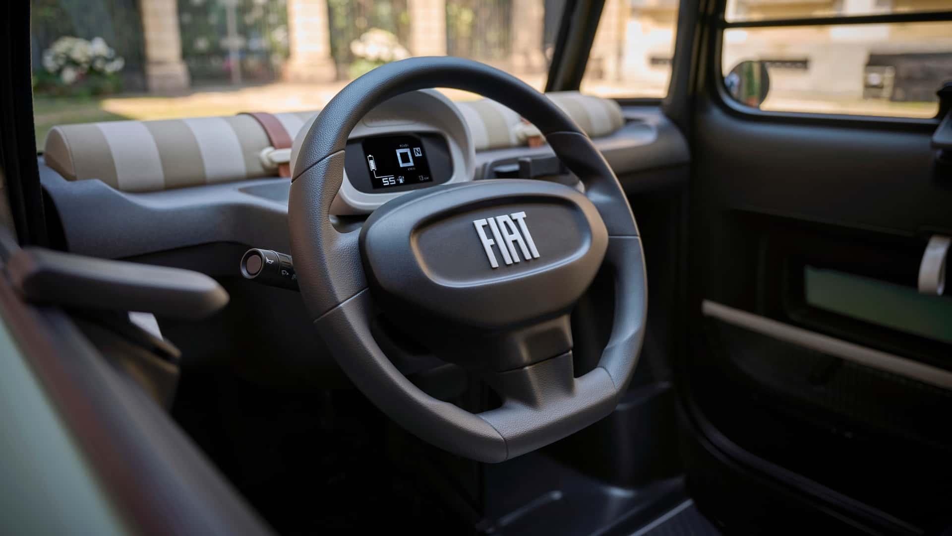 菲亚特Topolino EV十分小巧,其车身长度仅2.53米,外观十分呆萌,前脸为封闭式,两侧为小巧的圆形头灯,下方为银色防擦条,侧面采用对称式设计语言,车头和车尾几乎长成一个样,傻傻分不清楚,同时还使用了“开放式海滩主题”设计,配备帆布车顶以及绳索式车门,个性鲜明,符合意大利人的设计理念。