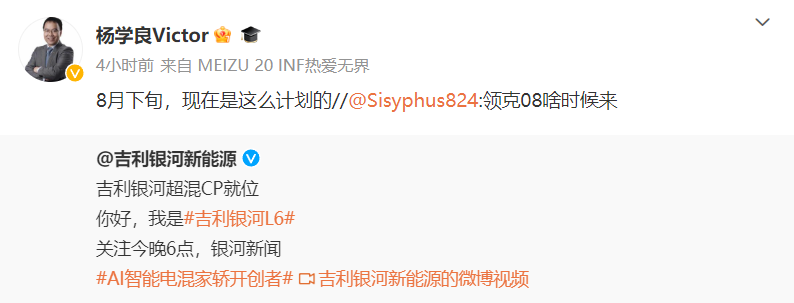 在吉利银河发布新车预告后,吉利控股集团高级副总裁杨学良在和网友的互动中透露:按照计划来看,领克08将于今年8月下旬正式发布。在此前的魅族发布会上,领克汽车官方就公布了不少关于领克08的信息。