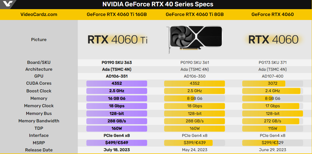 规格方面,除了显存容量,RTX 4060 Ti 16GB和8GB几乎没有任何区别。