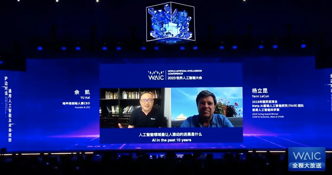 7月6日,图灵奖得主杨立昆和地平线创始人兼CEO余凯在2023世界人工智能大会上远程对谈。