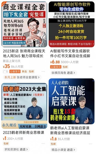 双重因素的叠加下,让不少人急于“充电”,四处寻求与AI创业、AI产品使用相关的资料,以解“燃眉之急”。正所谓有需求就有市场,在大众情绪的催生下,各大内容平台上涌现出了一批“AI课程”。