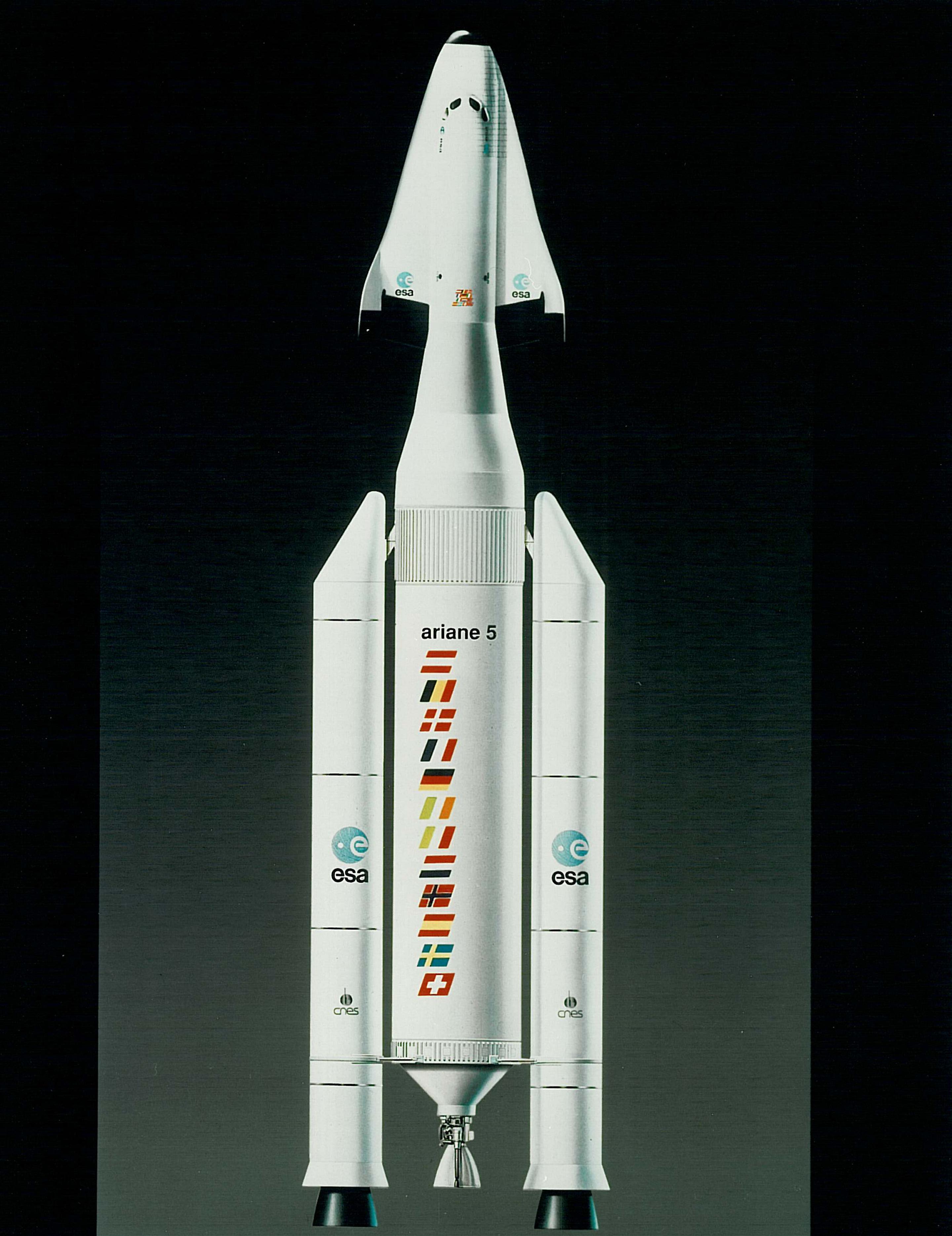 它也是欧洲第一枚载人火箭,因为它的最初任务是运载欧空局对美国航天飞机的回应,即赫尔墨斯航天飞机。尽管赫尔墨斯任务在1992年被取消,阿丽亚娜5号在1996年成为欧空局的旗舰助推器,因为它体现了欧洲的独立航天发射能力。