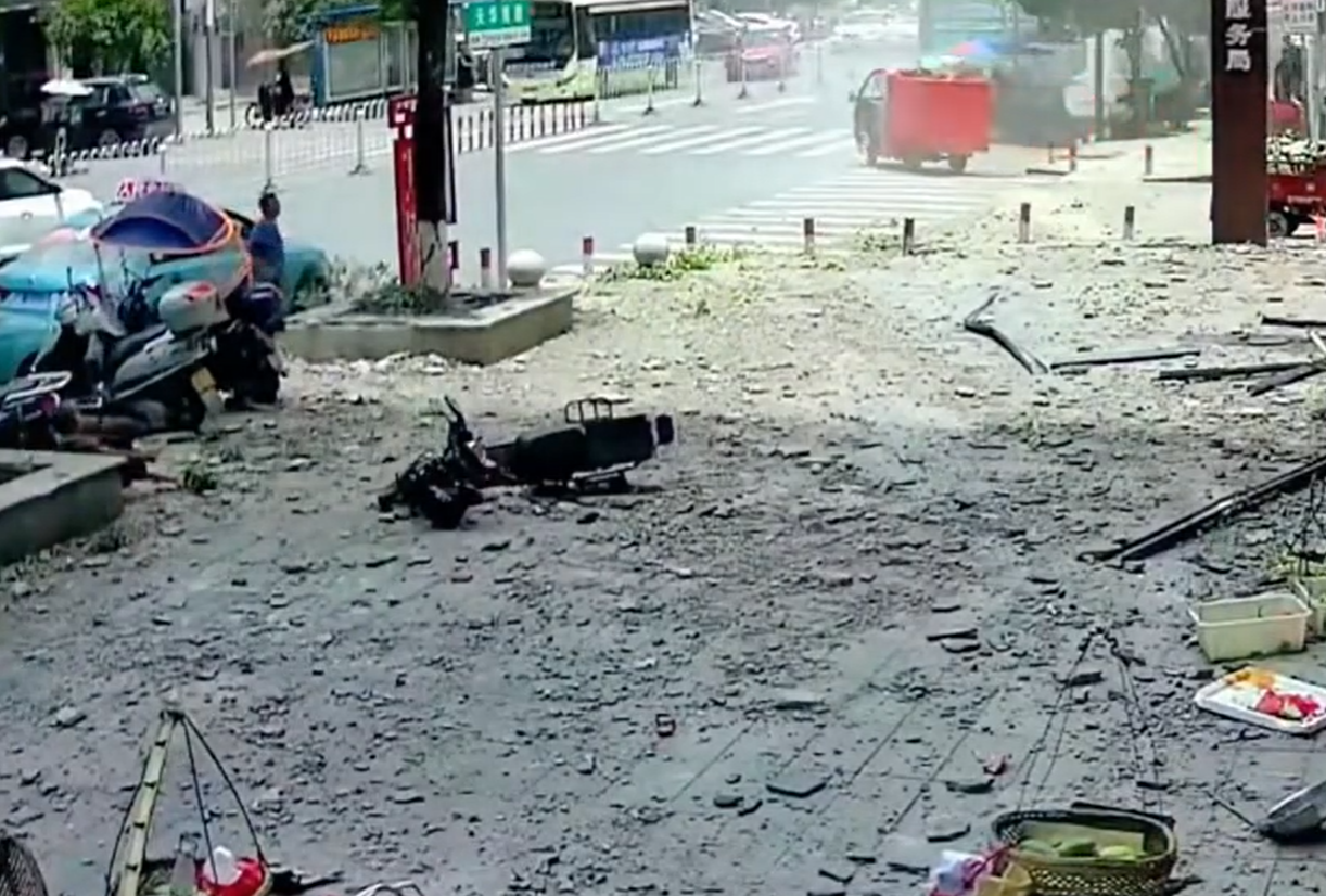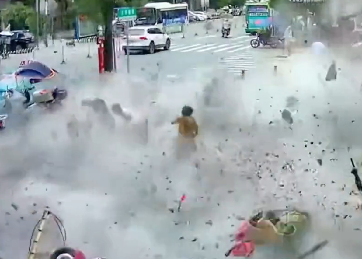 现场碎片翻飞,并激起了浓烈的烟尘,周围人群纷纷逃离,最早起身的老人距离事发地最近,她和骑电动车的女人、孩子一同被强烈的撞击波及倒地,好在并未被直接击中,逃过一劫,但目测应该受伤。