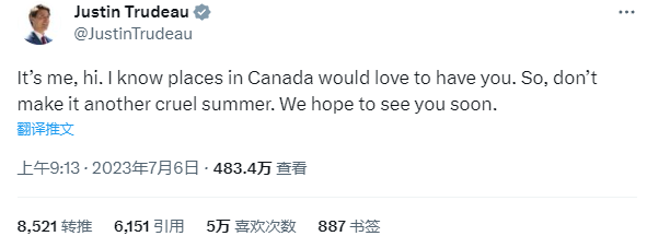 加拿大总理特鲁多在社交媒体上回复泰勒称:“我知道加拿大的一些地方很乐意接待您。所以,别让今年成为又一个残酷的夏天,希望能很快见到您。”