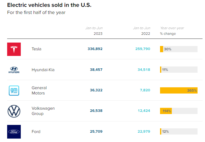 在美国电动汽车市场上,传统车企较去年相比卖出了更多的汽车,但依然很难缩小他们与行业龙头特斯拉公司之间的差距。根据市场研究机构Motor Intelligence的数据,在今年上半年,特斯拉在美国出售了超过33.6万辆电动汽车,领先第二名约30万辆,而去年同期这个数据仅为22.5万辆。