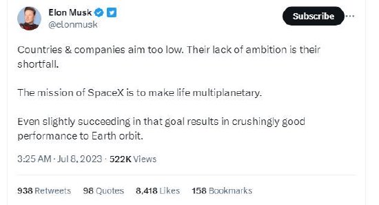 马斯克回应称:“国家和公司的目标太低了。缺乏雄心是他们的不足之处。SpaceX的使命是让生命多行星化。即使在这个目标上取得一点点成功,也会给地球轨道带来非常好的性能。”