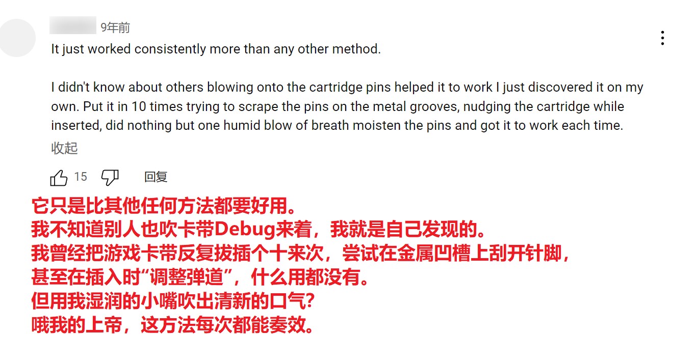 在油管上,不少欧美网友都分享了自己儿时Debug的经历。有人自称从小就很乐于尝试,面对游戏机尝试过多种维修方式,但最终还是选择了“吹气”。他的观点是“整那么多花里胡哨的,不如吹口气省事儿”。
