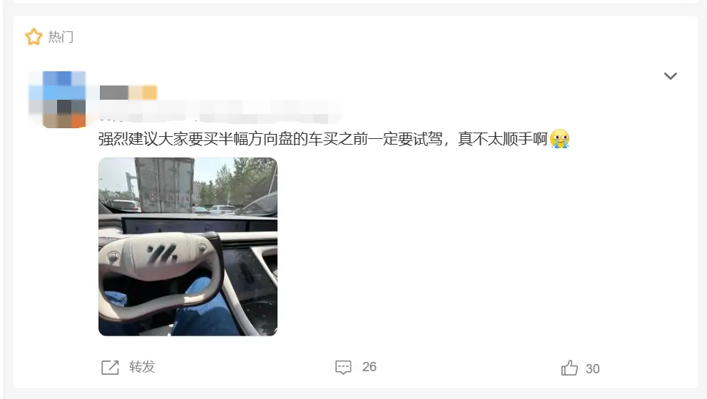 不少体验过的博主也表示,半幅方向盘在买之前一定要试驾体验,不然真的不太顺手。