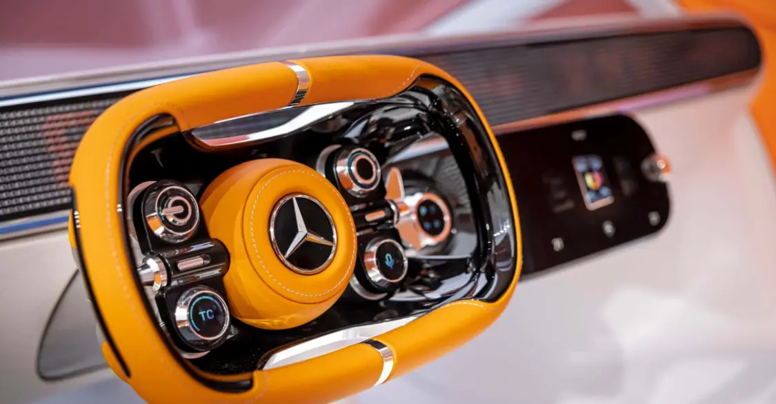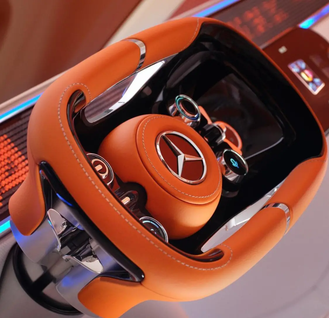 奔驰的轭式方向盘设计灵感来自于近期公布的概念车Vision One-Eleven,严格意义上它跟现在的半幅方向盘都不一样,形态上更接近赛车。我很纳闷奔驰为何要将赛车元素放进“老板车”里。而且奔驰的态度似乎很坚决,决定在改版后的EQS轿车上率先实现,这款车可能在2至3年内上市。