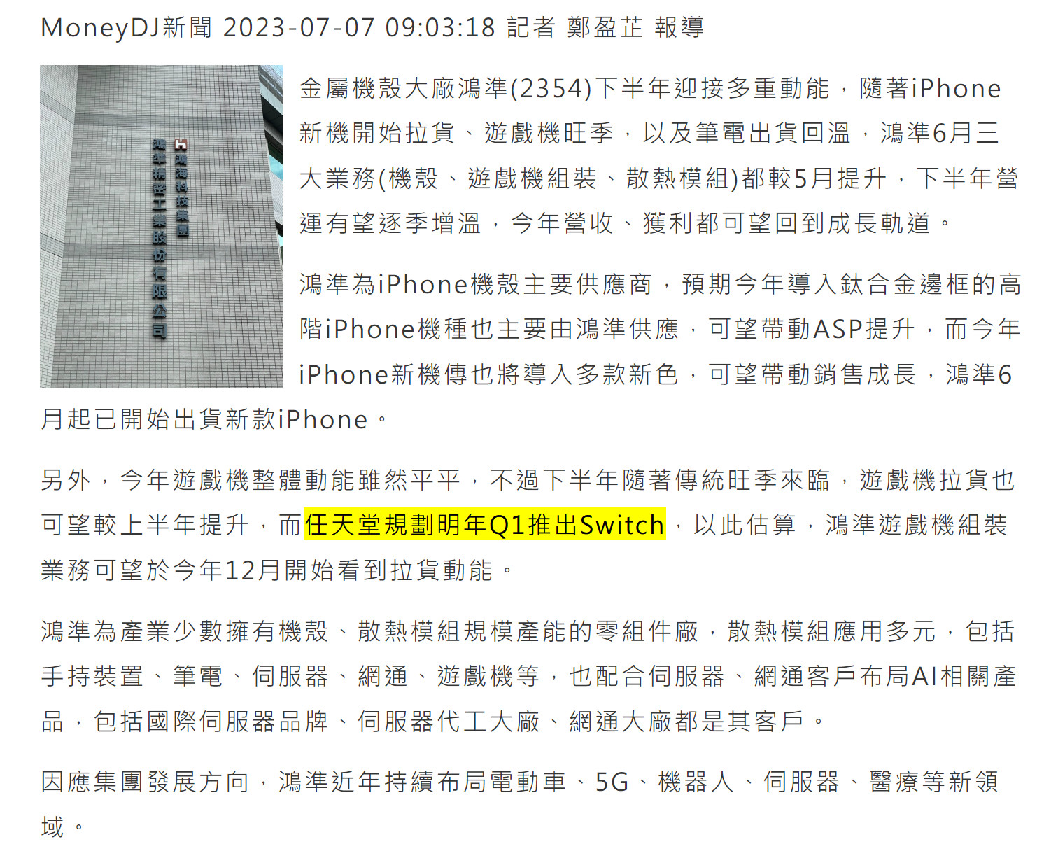 尚未公布的Switch继任主机可能不会太远了。Reddit上有玩家发现了中国台湾媒体MoneyDJ的相关报道,标题为“拥iPhone、游戏机、散热动能,鸿准下半年营运增”。文章指出,由于任天堂计划2024年第一季度推出新的主机,因此预测这家金属机壳制造商鸿准今年下半年的销售业绩将会增加。