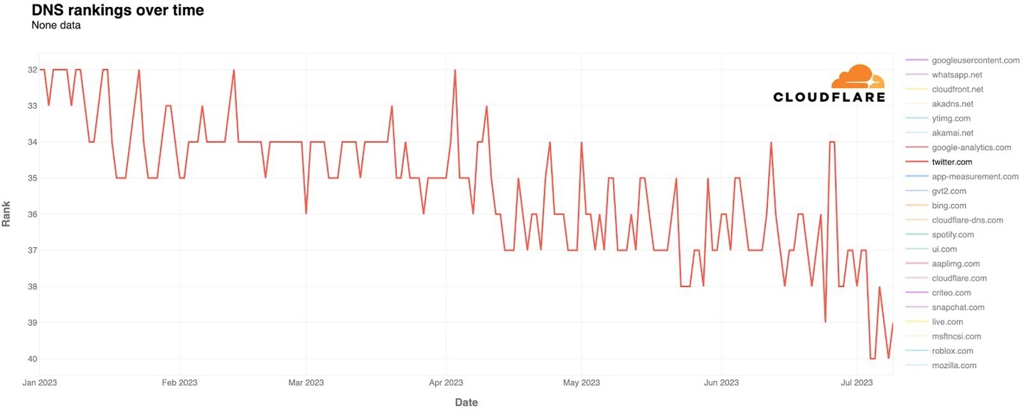 根据Cloudflare追踪访问推特的DNS服务器流量记录,目前推特的流量正急速下滑中。