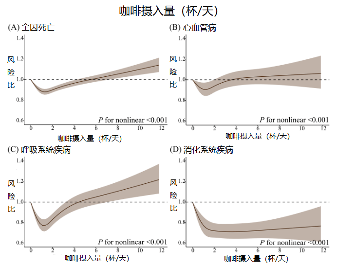 具体来说,每天喝小于 1~2 杯咖啡时,观察到的全因、心血管疾病和呼吸系统疾病的死亡率是最低的[2]。