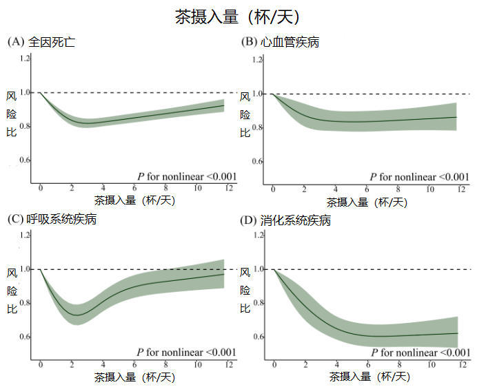 具体来说,每天喝 3 杯茶时,全因死亡风险最低;而每天喝6杯茶时,可以让消化系统疾病的死亡风险最低[2]。