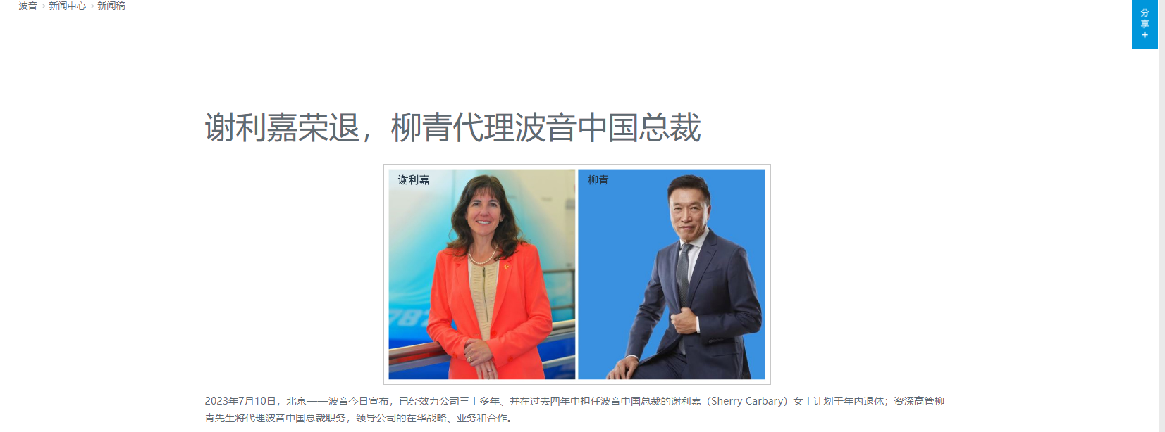 目前领导波音中国政府关系团队的柳青将代理波音中国总裁的工作,将领导团队继续推进公司在华战略,直至公司正式任命新的总裁。