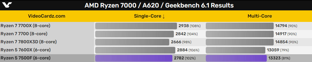 GeekBench 6.1测试数据库中已经出现了锐龙5 7500F,不过和GeekBench 6.0版本成绩无法直接对比,因此能参考的型号不多。