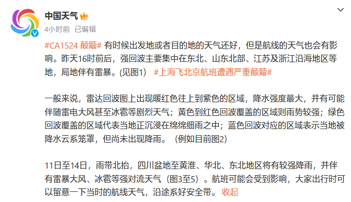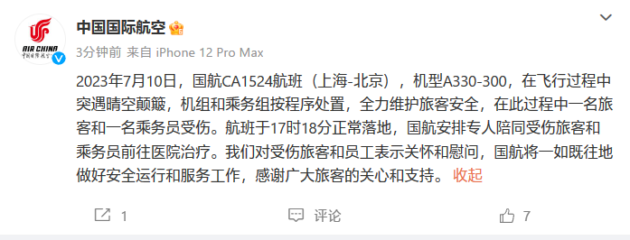 今早关于国航CA1524航班飞行颠簸的事情引起广泛关注。刚刚,中国国际航空方面通过官微发文回应称:2023年7月10日,国航CA1524航班(上海-北京),机型A330-300,在飞行过程中突遇晴空颠簸,机组和乘务组按程序处置,全力维护旅客安全,在此过程中一名旅客和一名乘务员受伤。