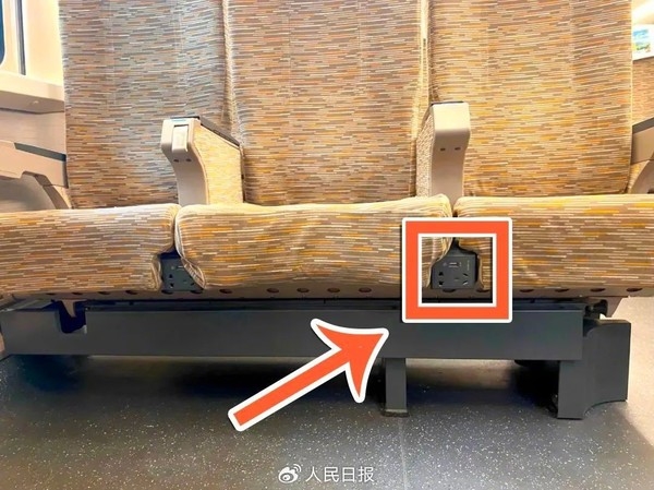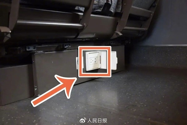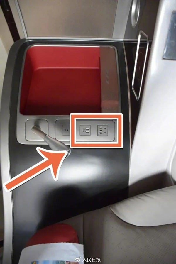 CRH380A型动车组列车:商务座席的充电接口,位于座椅扶手下方位置;一等座席和二等座席的充电接口,均位于座椅下方,打开插座防护盖即可充电。