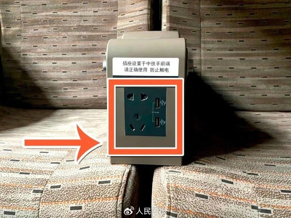 AF-Z型复兴号智能动车组列车:复兴号智能动车组商务座席的充电接口,有插孔和USB两种方式,同时还支持手机无线充电;一等座席充电接口位于座椅扶手中间,有插孔和USB两种方式;二等座席充电接口位于两个座椅中间下方位置,有插孔和USB两种方式。
