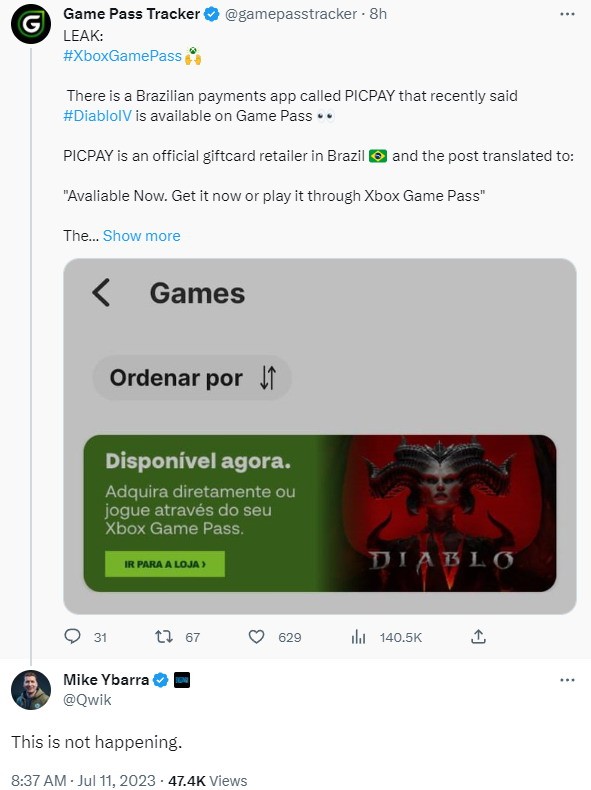 之前巴西的官方礼品卡零售商PicPay的App中有横幅广告显示,《暗黑破坏神4》已加入到Game Pass,现在可通过XGP游玩。不过该广告很快被移除,有人猜测《暗黑4》将于近期加入Game Pass。