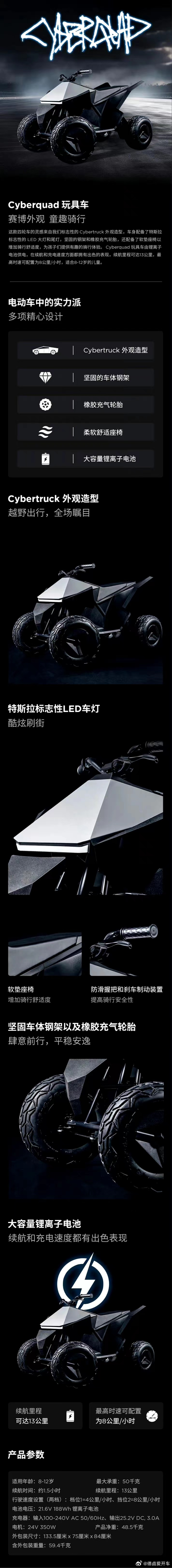 特斯拉将在中国市场上市“纯电越野摩托”,这款车主要针对儿童而设计,形似ATV,全名为Cyberquad For Kids早在2021年底,特斯拉就在其海外官方商店上架了这款产品,其设计最高时速8km/h,内置锂离子电池,最大行驶里程为13km,售11990元。
